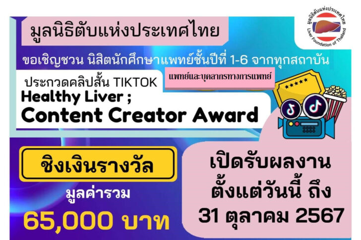 ขอเชิญร่วมประกวดคลิปสั้น TIKTOK “Healthy Liver ; Content Creator Award” ชิงเงินรางวัล (มูลค่ารวม 65,000 บาท)