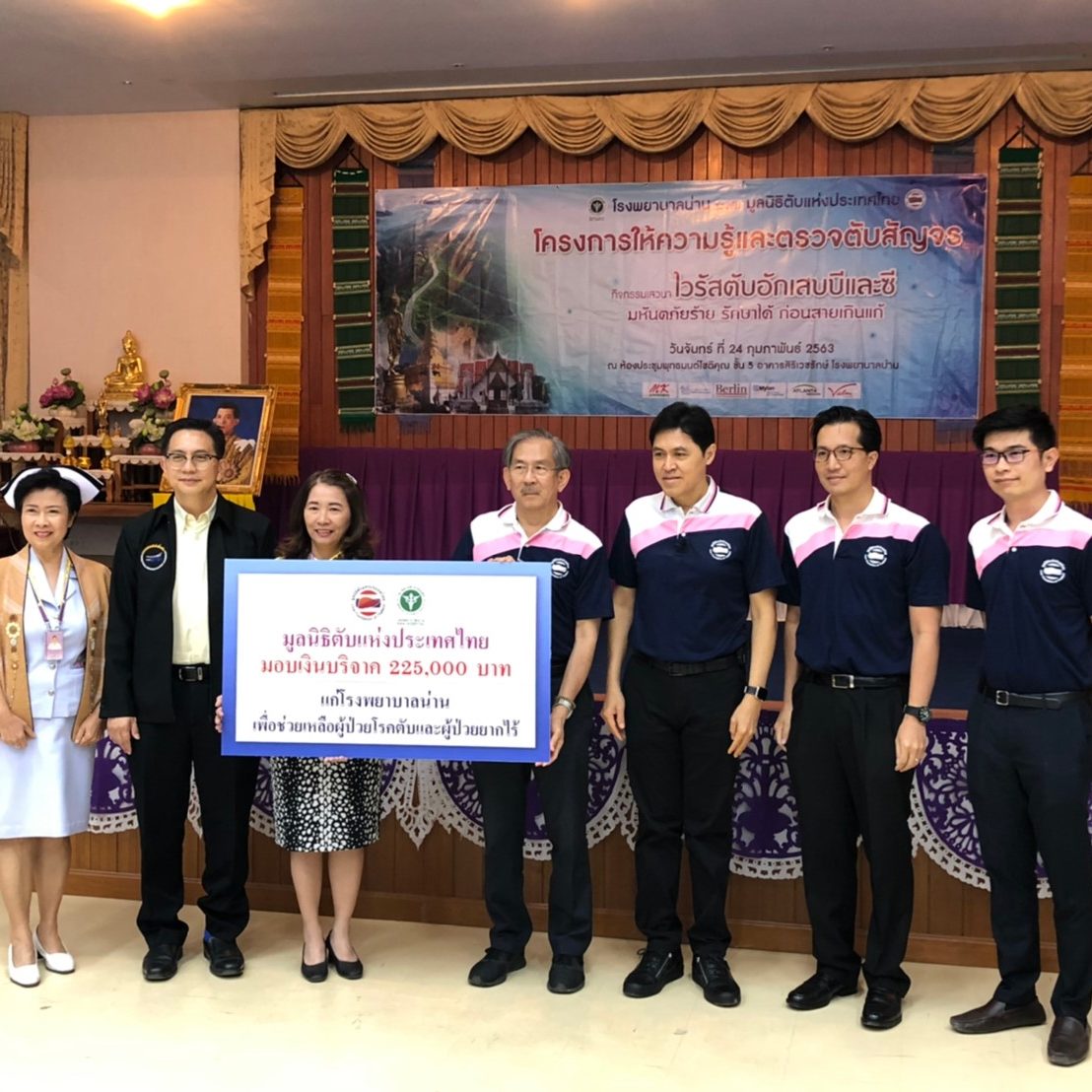 ในการนี้ทางมูลนิธิตับแห่งประเทศไทย ได้มอบเงินให้กับทางรพ.น่าน เพื่อช่วยเหลือผู้ป่วยโรคตับที่ขาดแคลนทุนทรัพย์และผู้ป่วยยากไร้ จำนวน 225,000.00 บาท